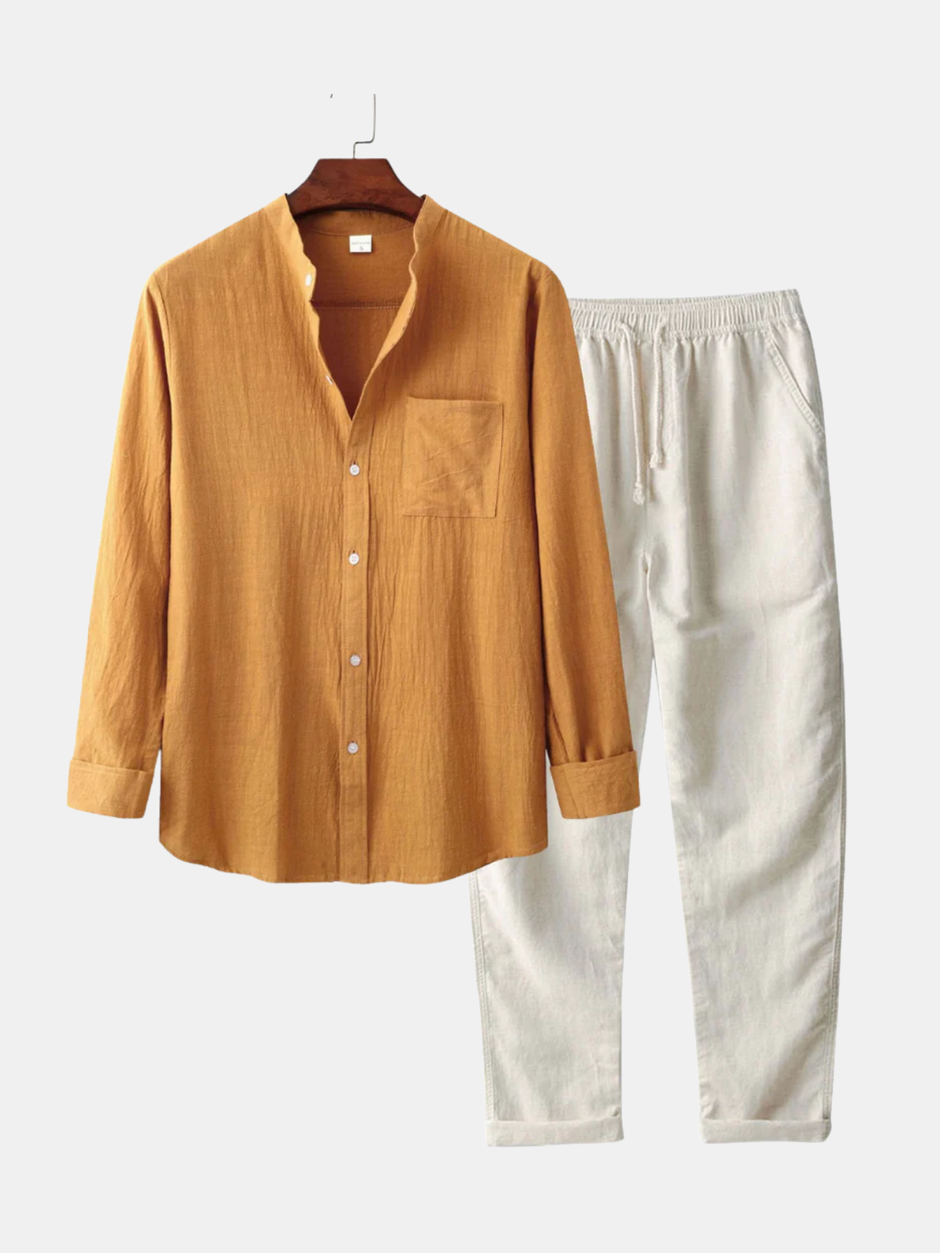 The Belize Ensemble combines relaxed comfort with refined styling. Featuring a lightweight, breathable shirt and coordinating trousers, this set is perfect for warm days while maintaining a polished, effortless aesthetic.