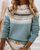 Its light blue, soft pink or grey base is lifted by a refined Nordic-inspired pattern in cream, black, and beige, giving it a timeless look that never goes out of style. The relaxed silhouette drapes beautifully without feeling bulky, while ribbed trims add a polished touch that keeps the sweater in shape season after season.