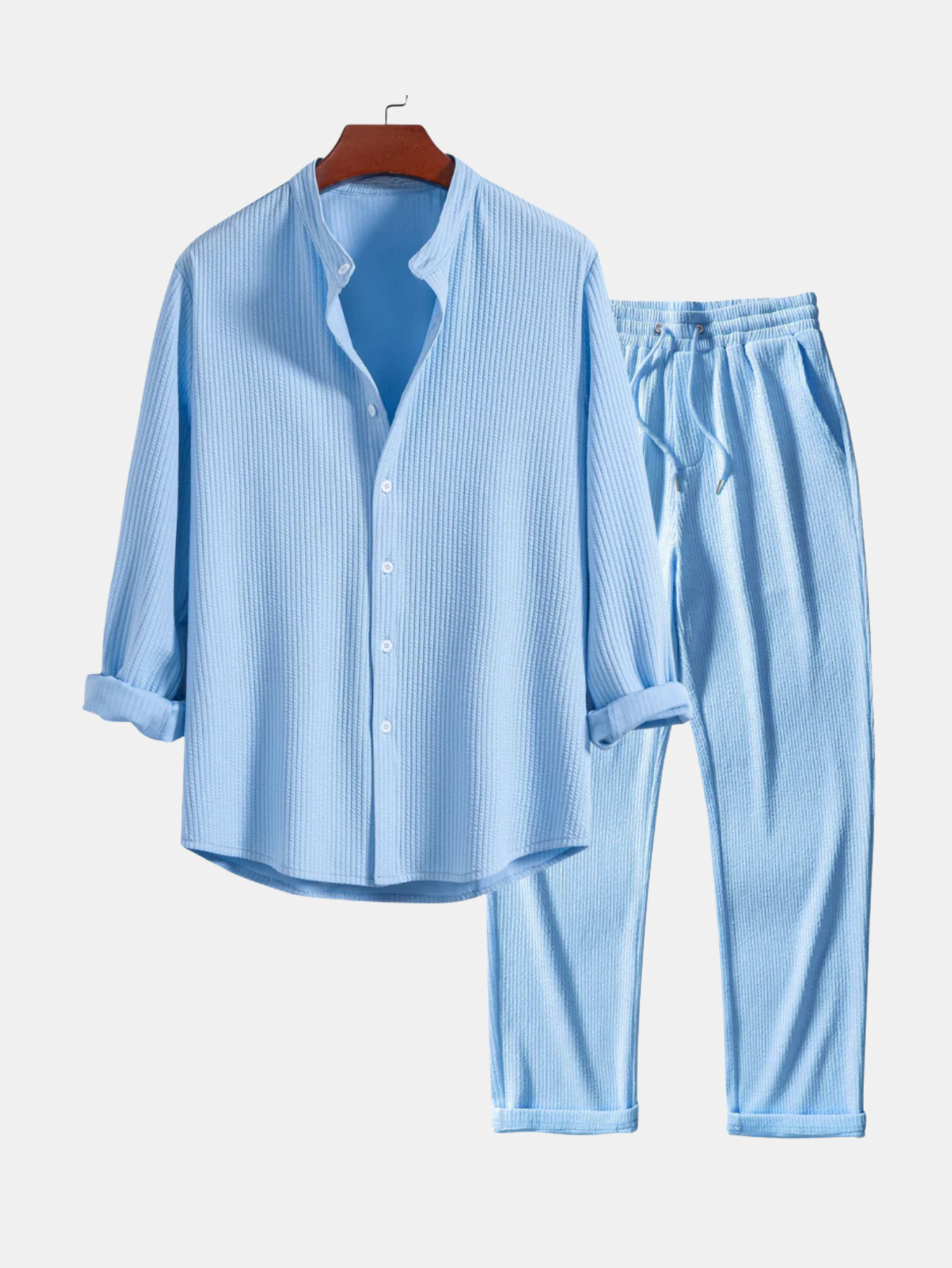 The Corcega Ensemble merges casual comfort with polished style. Featuring a lightweight, breathable shirt and coordinating trousers, this set is perfect for relaxed days while maintaining a sophisticated, effortless aesthetic.