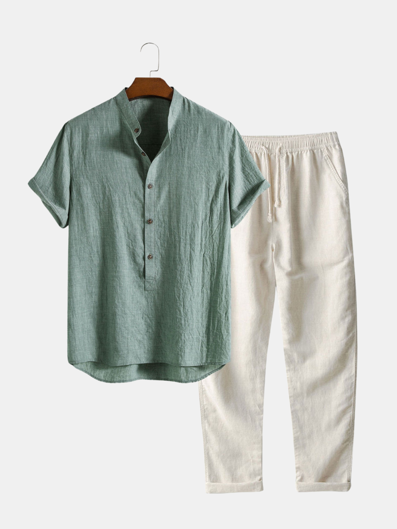 This Mandarin Collar Two-Piece Summer Set blends relaxed style with practical design. Featuring a short-sleeve shirt with a half-button placket and rolled sleeves, paired with elasticated drawstring trousers, it offers breathable comfort and ease of movement for warm-weather days.